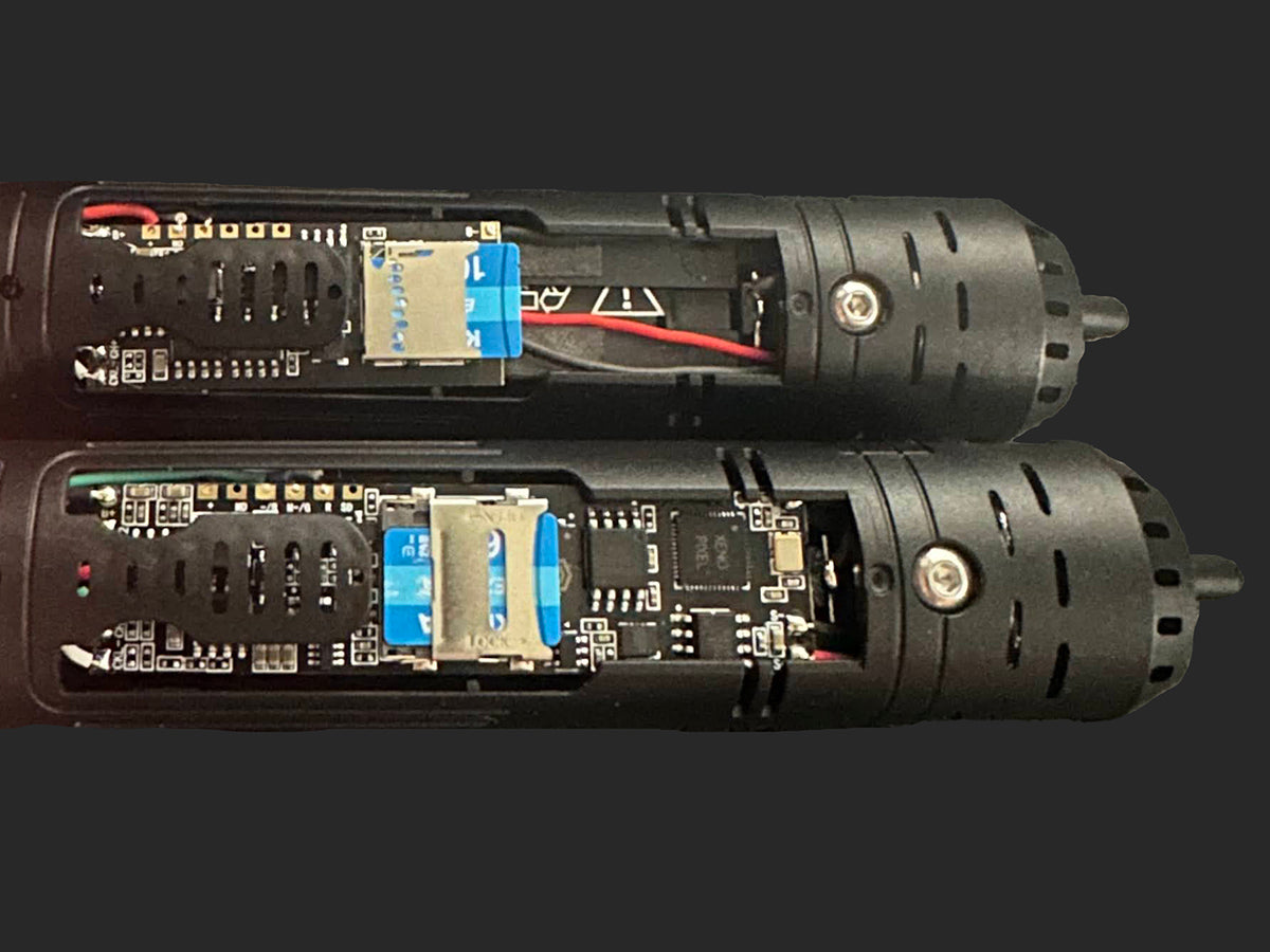 Our initial launch of the saber came with a full-length board that completely covered the battery and wires. This version also had an SD card slot that would slide and lift to release the SD card. The SD card would then be reinstalled and the door closed.