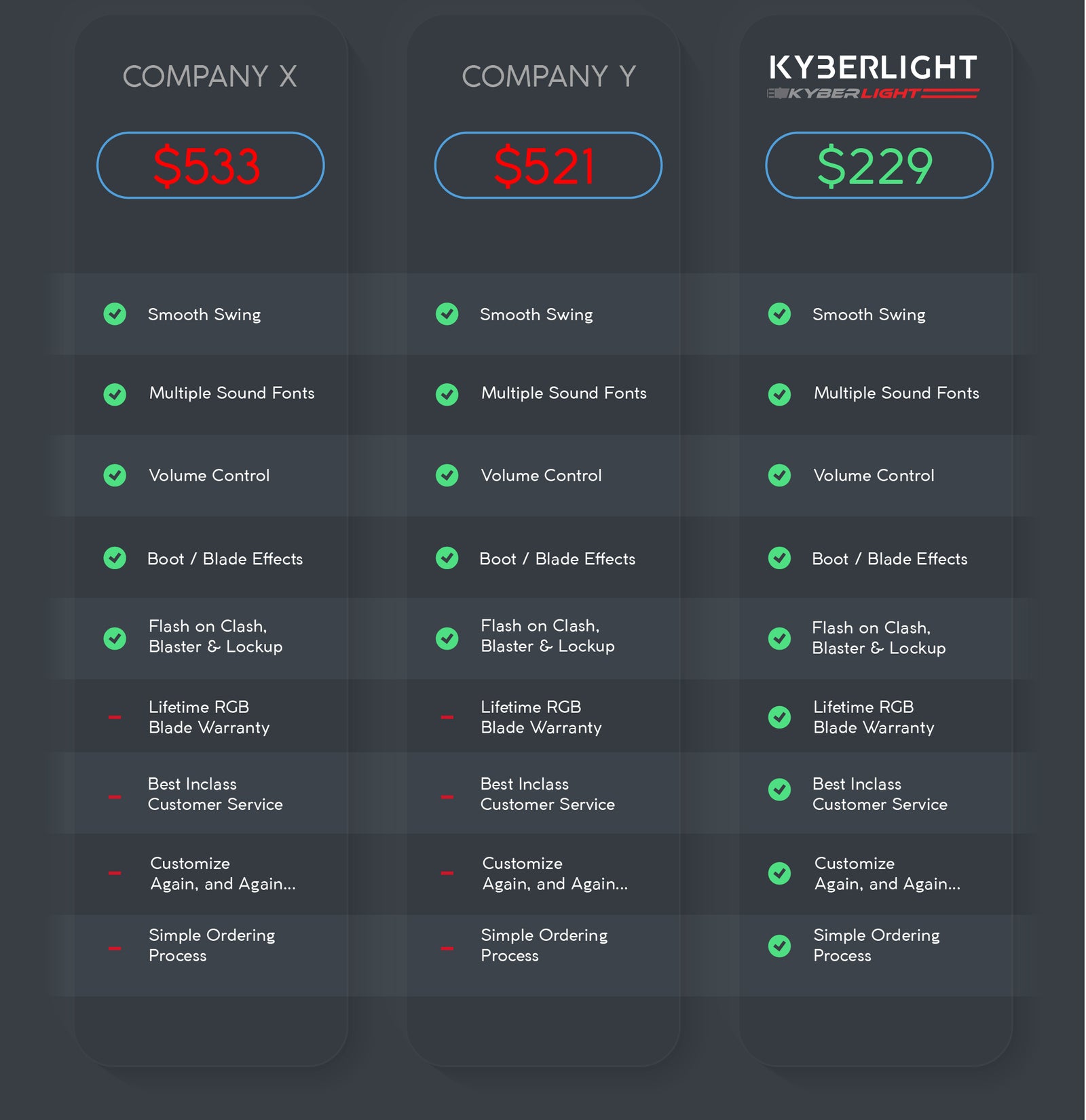 Every Kyberlight lightsaber comes with infinite color options, multiple sound fonts. Flash on Clash, Blaster, Lockup, and Smooth Swing.