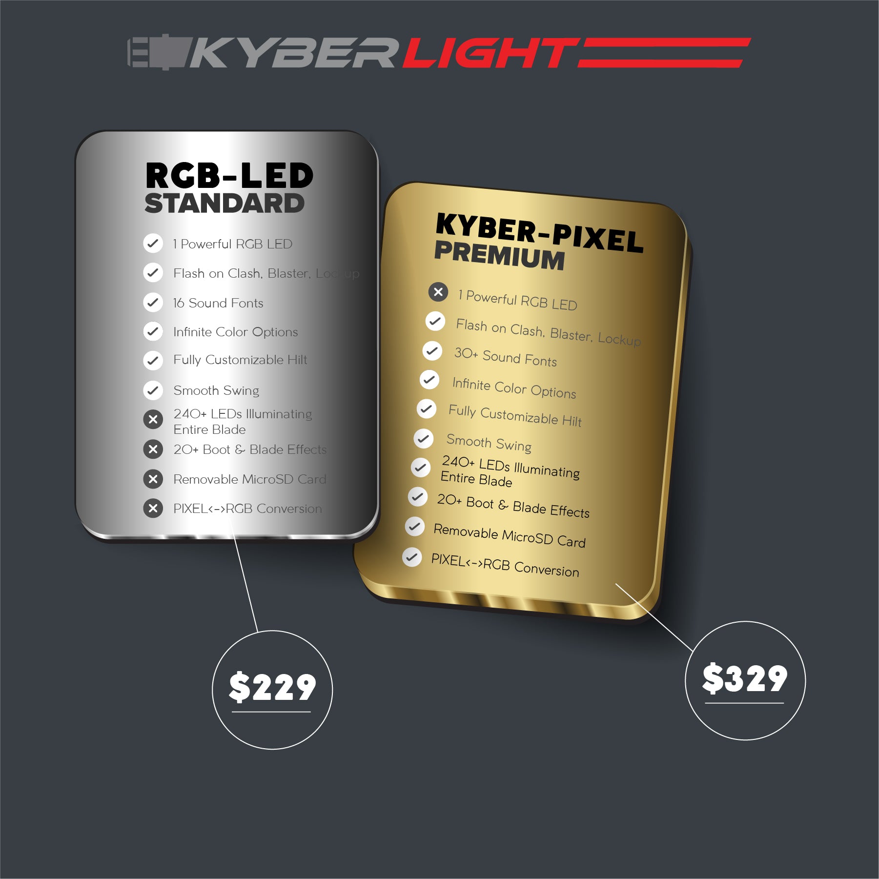 CHOOSE FROM OUR STANDARD RGB LED OR PREMIUM KYBER-PIXEL SABERS